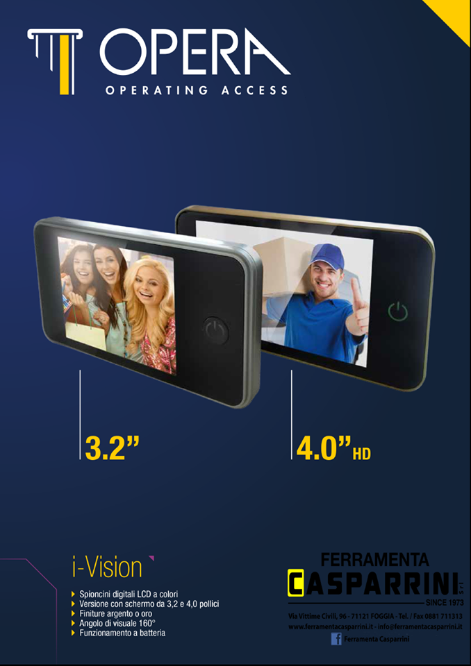 i-Vision è una evoluta serie di spioncini elettronici dal design elegante in soli 16 millimetri di spessore. L'inserimento dello spioncino elettronico sulla porta blindata permette di visualizzare chi si trova all'esterno tramite un'immagine a colori ingrandita senza essere visti. In questo modo, premendo semplicemente un pulsante, viene agevolata la visualizzazione anche ai bambini che altrimenti non arriverebbero all'altezza dello spioncino tradizionale e alle persone che hanno deficit visivi.